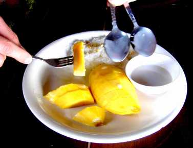 However, sticky rice offers something ordinary jasmine rice never can, for mixed with coconut milk, sprinkled with nuts and served with mangos, it becomes Kao Niao Maa Muong... Mouthwatering (see right)