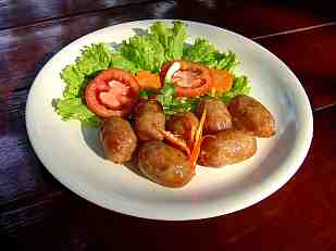 Well, we have a large Vietnamese population here in the north-east and they like to make sausages, particularly sour ones stuffed with herbs. So Saikraw means sausage and Preow means sour...and they're delicious! (See left)