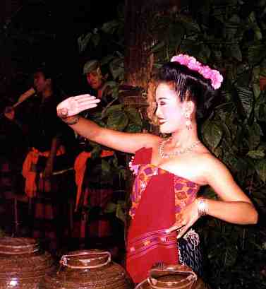| The Isan Pot Dance is very much a local tradition only seen in this part of Thailand. A young girl "plays" the pots while the band behind her synchronize their sound with her movements, so it appears as if she is making the music. Moreover, as she runs her hands from left to right across the pots, so the musicians behind her run up and down the musical scale. It requires a high degree of skill to make this magic of "a music to the dance" rather than "a dance to the music". |