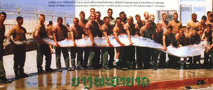 | Oh yes, some may say the whole fireball phenomenon is just a giant hoax …but then how can it be? …for their exact vertical trajectory, their lack of sound and random occurrence (not to mention the thousands of people who have failed in their attempts to expose the hoaxers …if they exist) are hard things to fabricate! And if it was a hoax, wouldn't there be more fireballs every year? In 2018, however, there were lots and lots of fireballs. This came after several years of very few fireballs. Was this because 2018 was a very wet year, when the river was very high and flooded in Nong Khai Province? However, in 2013, even though it was a dry year there also a lot of Fireballs. For many years the picture below has been circulating as proof of the existence of Giant Serpents in the Maekong River. Local people call it the Naga Queen and say that it was seized from the river by American GI's stationed at a Lao Military base on the 27th of June 1973. However, a couple of years ago I came across the same shot, featured in a rather unreliable source, which claimed it to be of an "Oar Fish" caught by American Marines in the Caribbean... |