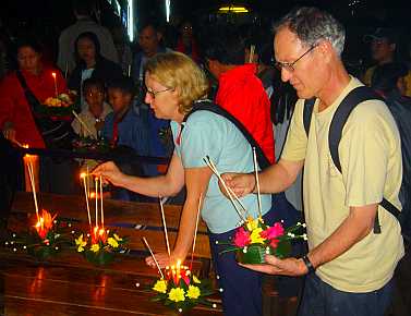 To thank the waters for raining on the paddy fields and so producing a bountiful crop, each and every person places a little shrine made from banana leaves and decorated with flowers, incense and candles onto the surface of a river, lake or canal. As we live beside the Maekong river, the significance of water has greater meaning, and so our festival is pleasingly special. |